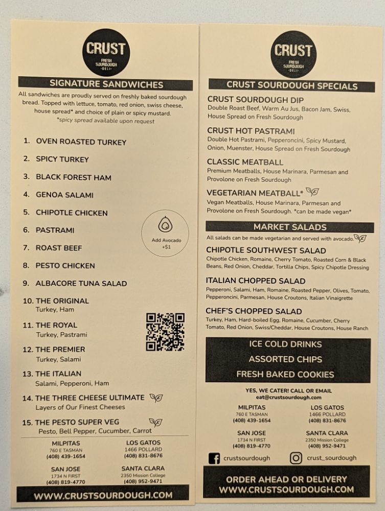 Introducing CRUST - Fresh Sourdough Deli, a hidden gem in Santa Clara offering freshly baked sourdough sandwiches, signature cookies, and a variety of chips. The menu features mouth-watering options like the Oven Roasted Turkey Sandwich and The Original Sandwich, both piled high with delicious fillings. Customers rave about the quality of the bread, the freshness of the ingredients, and the friendly service. With options for takeout, delivery, and catering, CRUST provides a convenient and satisfying dining experience. Don't miss out on their delectable Choco Coco Mac Cookie or Lemon Delight Cookies, perfect for satisfying your sweet tooth. Visit CRUST - Fresh Sourdough Deli for a delightful culinary experience that will leave you coming back for more.